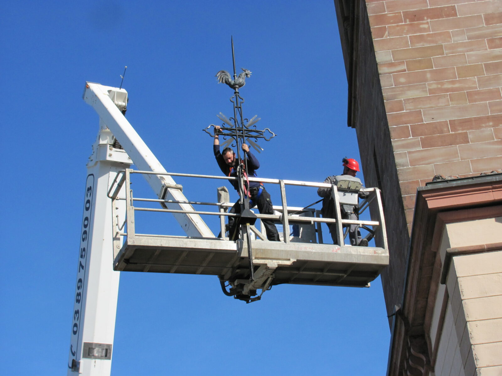 In dieser Höhe zu arbeiten ist alles andere als banal. Zunächst musste eine Hubarbeitsbühne gefunden werden, die hoch genug ist, um die Spitze des Kirchturms zu erreichen. Eine beeindruckende, technische Maßnahme, die Ruhe, Präzision und Vertrauen zwischen allen Beteiligten erfordert.
