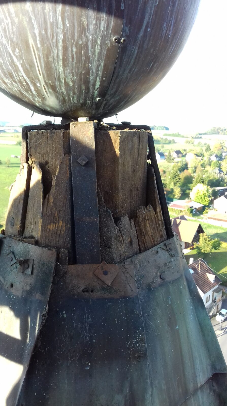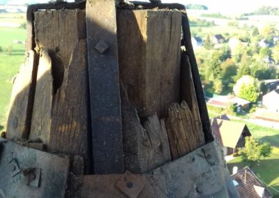 Nach Abschluss dieser Arbeiten konnte das Kreuz wieder nach oben gebracht und sicher befestigt werden – zurück an seinen Platz auf der Turmspitze.