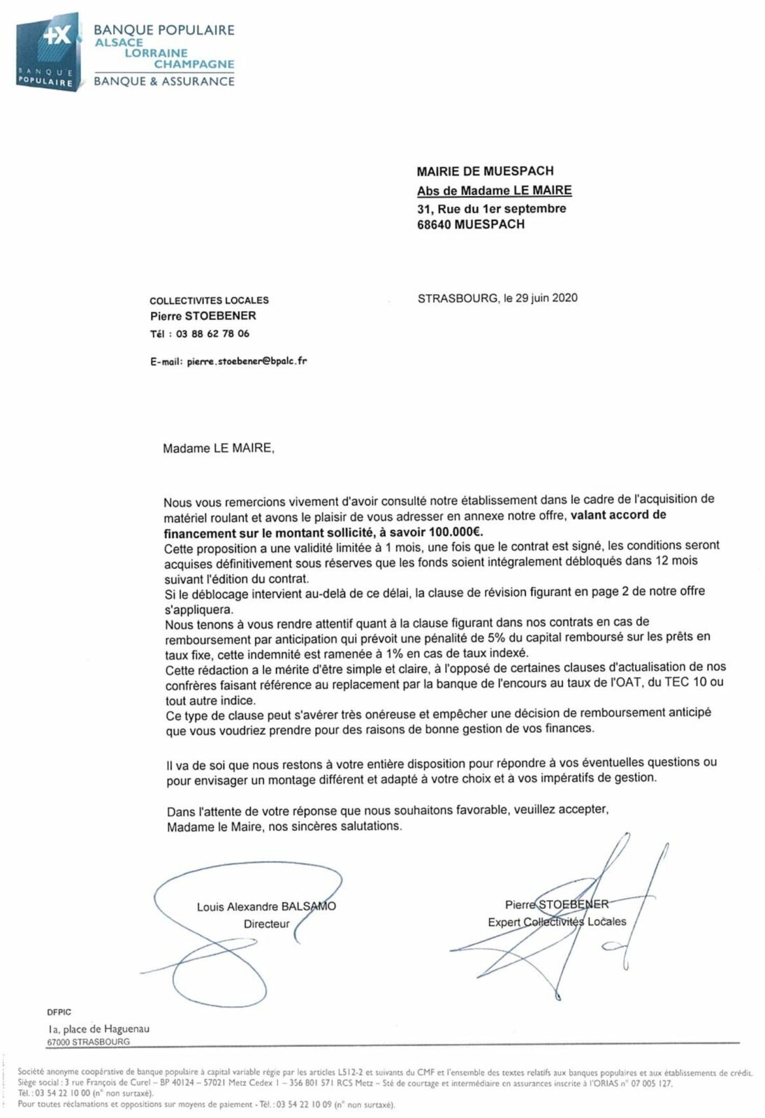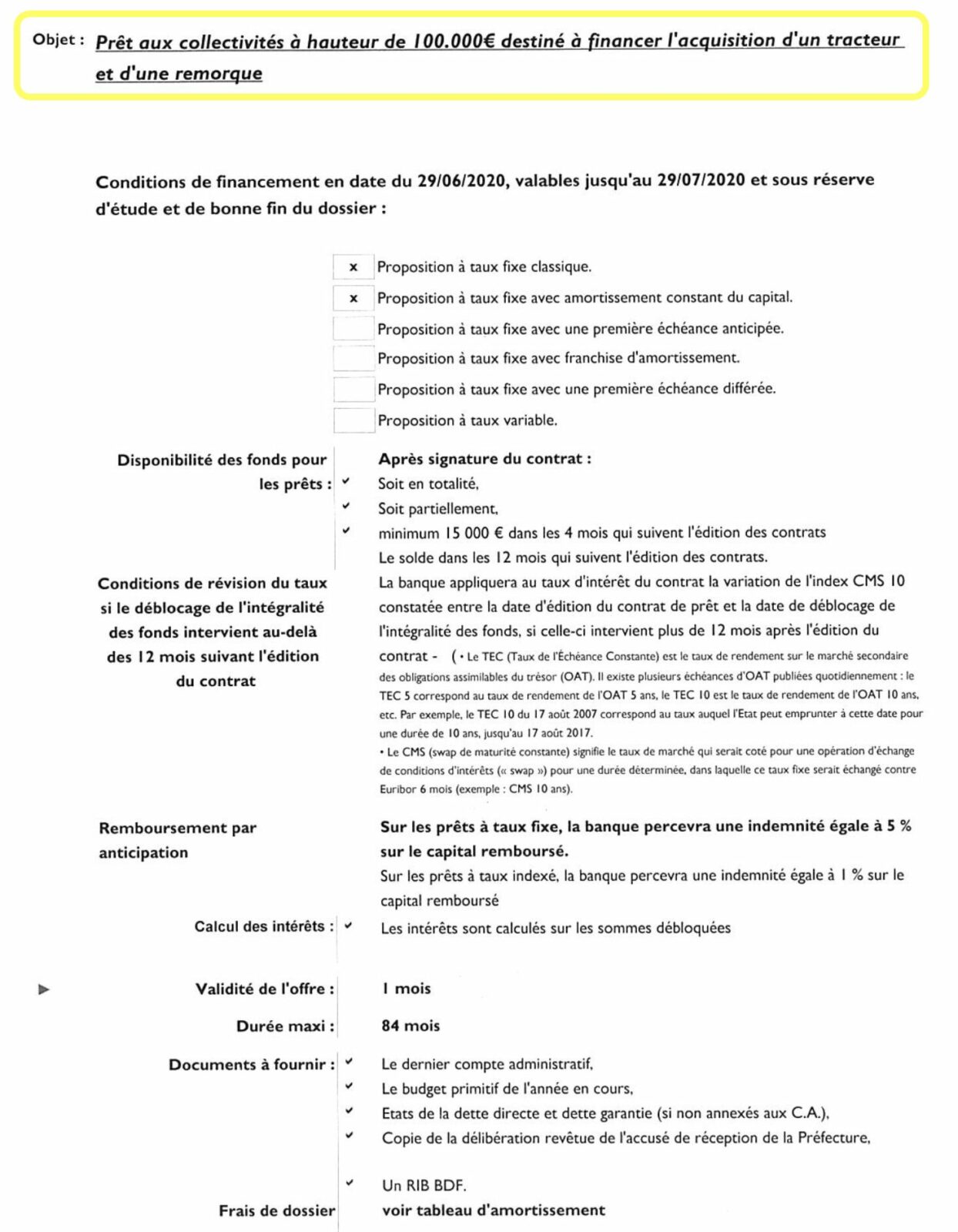 Une offre de prêt de 100 000 € adressée à la mairie de Muespach le 29 juin 2020, quelques semaines seulement après l’installation de la nouvelle municipalité, démontre qu’une banque était prête à financer l’acquisition d’un tracteur communal.